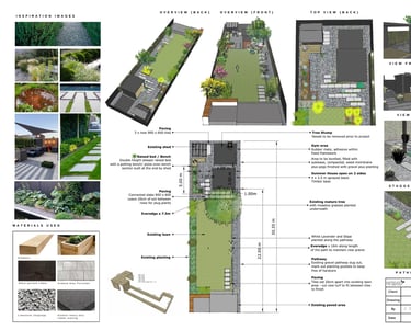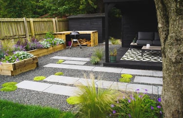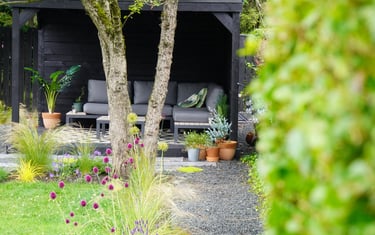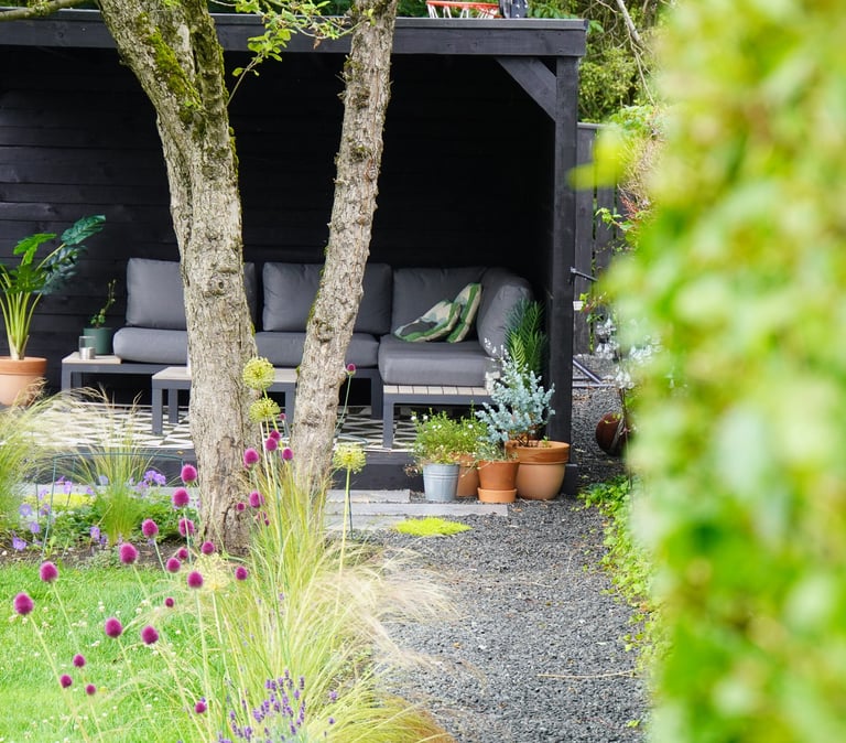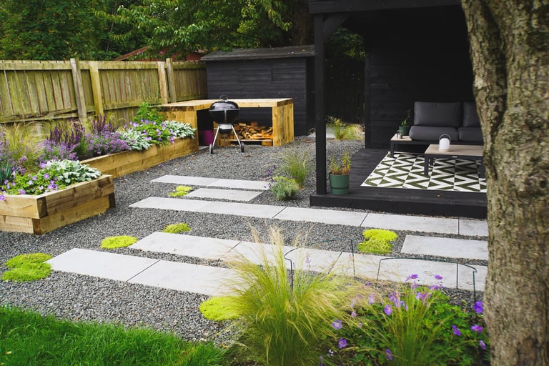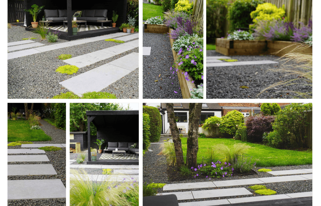 A busy family in Newcastle wanted to incorporate into their garden distinct but connected spaces to socialise, cook, relax, work and also work out. I focussed the budget on the part the garden that could most seamlessly facilitate this whilst maximising light, views and existing established planting. This involved installing a substantial open-sided pergola surrounded by staggered paving, contrasting with natural limestone gravel and pops of creeping plants. To make a feature of the mature apple tree, we underplanted with grasses full of texture and movement. I kept proportions of the space in balance by building a large raised planter that connects to a potting / cooking bench.