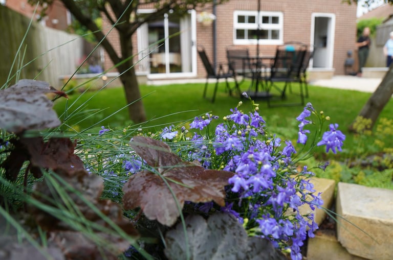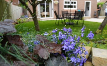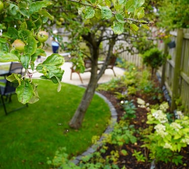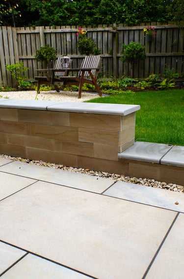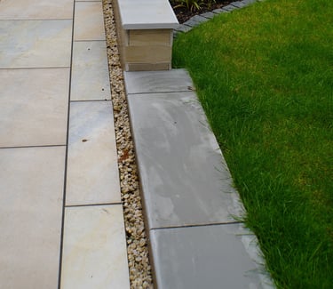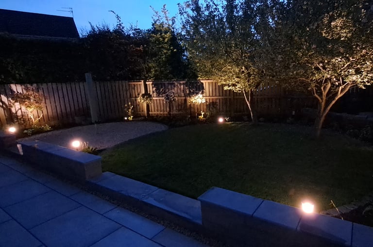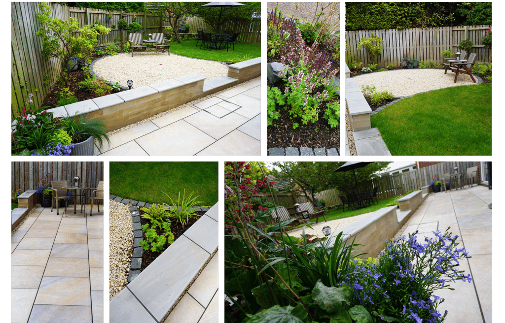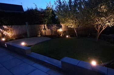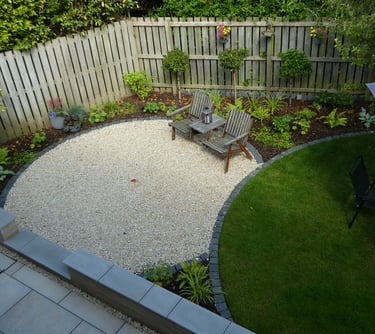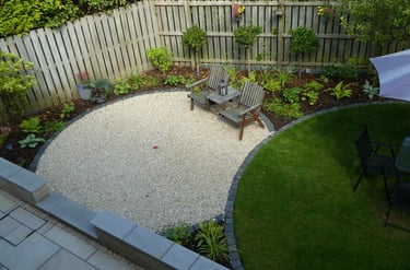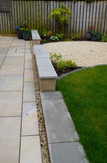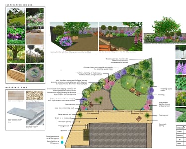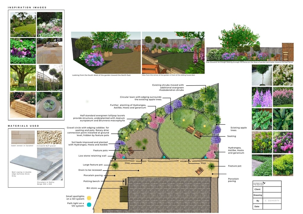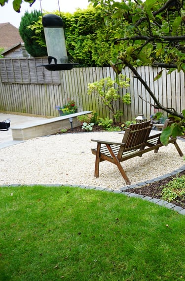 The brief for this project was to transform a shaded, uneven garden into a brighter, modern and relaxing space. The plot is also set at an awkward angle that needed to be bought into balance with the rest of the space. I used a retaining wall to create layers within the space and a sense of movement from the new porcelain terrace adjacent to the house, into the relaxing areas of the garden. Adjoining circles create relaxing sense of flow and the soften the angles of the fence line. Using gravel in the first reflects light back into the space and compliments the warmer tones in the wall and porcelain tiles. The new grass is set to frame the pair of existing apple trees. and practically requires less upkeep. I also implemented a new planting and lighting scheme designed to add structure, texture, reflection and and shadow for year round enjoyment.
